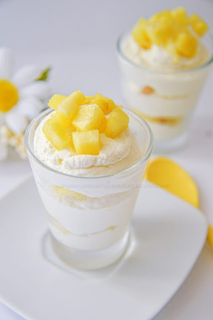 Em taças ou copos, coloque no fundo um pouco de bolacha maria triturada, cubra com uma camada de mousse, cubra com pedaços de ananás.